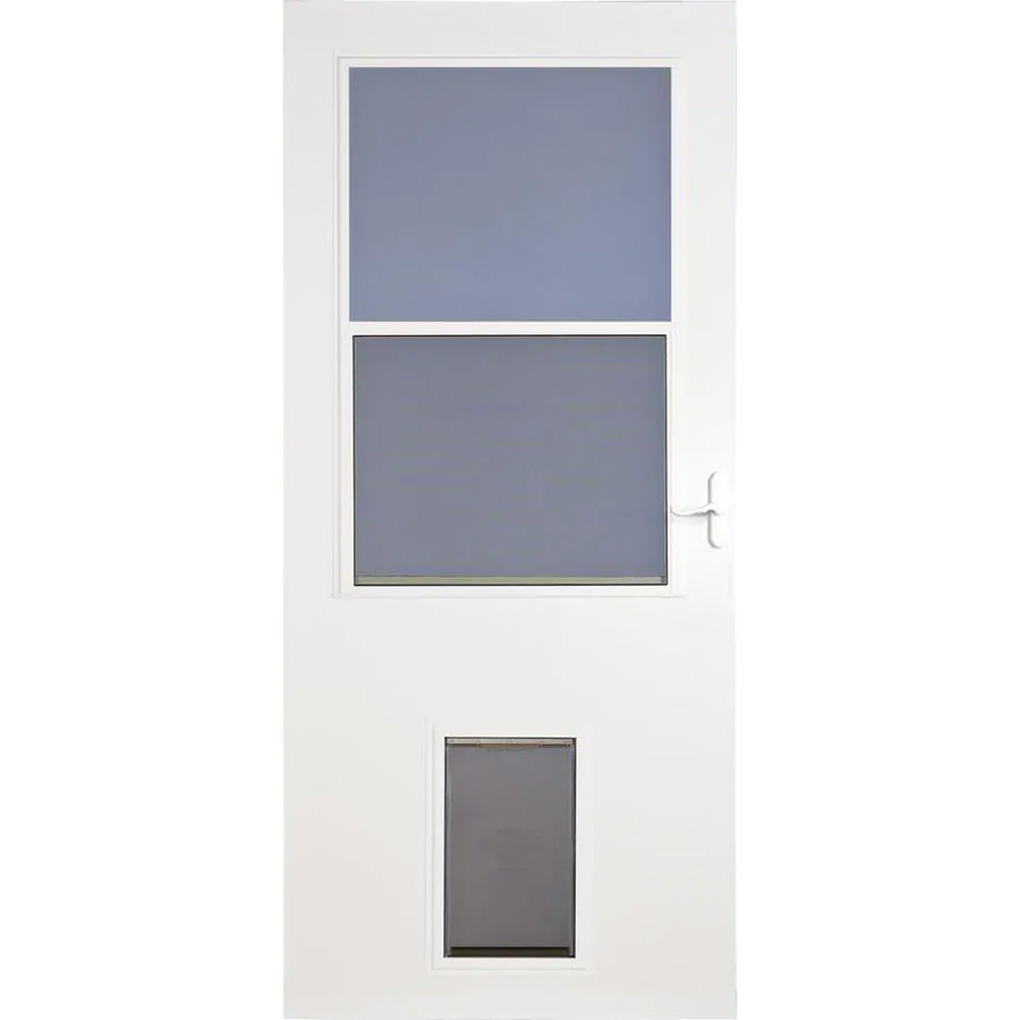 Adding a pet door just got easier. The pet door storm door fits large breed pets up to 100 lbs and features a factory installed 10-in x 17-in pet door and inside security panel. The traditional half-screen adjusts for bottom ventilation. The solid wood core with maintenance-free DuraTech® finish protects against age and the weather. Color match Secure Lock® handle set includes matching interior and exterior levers and a built-in security lock system. REVERSA-HINGE systems allows for right or left mounts.